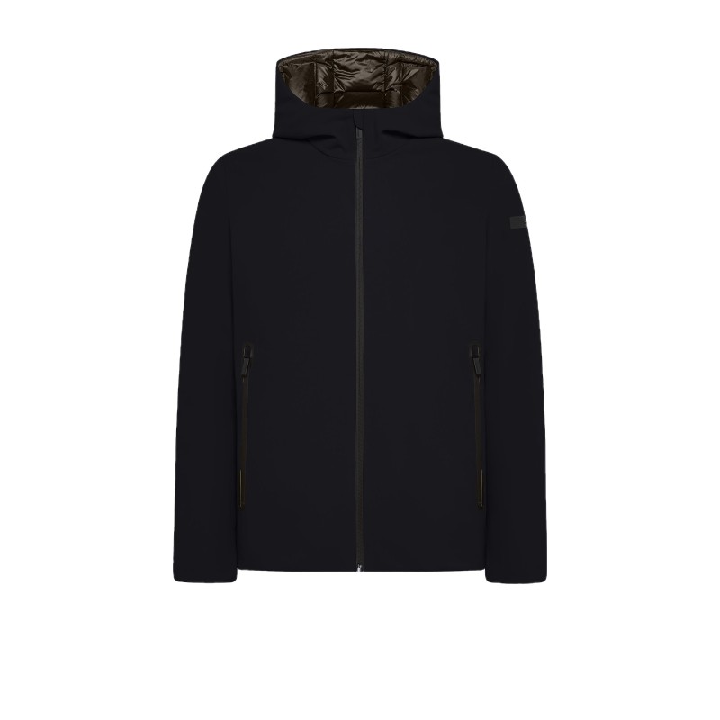 Giubbotto con cappuccio realizzato in tessuto tecnico antivento e antipioggia.